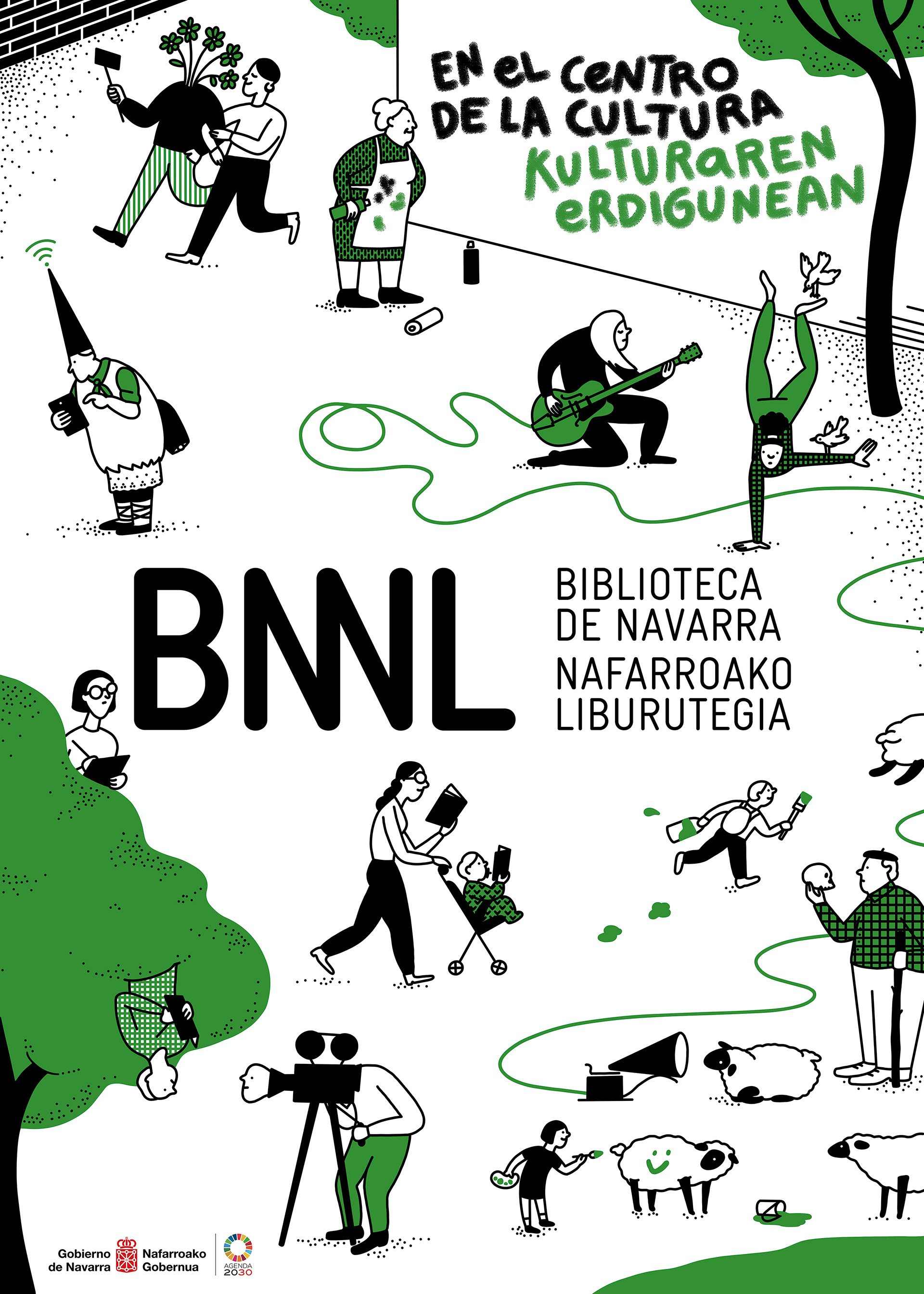 Esta es la lona que he dibujado para la Biblioteca de Navarra. Bajo el lema 'En el centro de la cultura / Kulturaren erdigunean' me propusieron realizar una imagen que acercara la biblioteca y sus mĂșltiples actividades a sus diferentes perfiles de usuari@s.